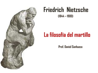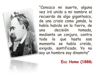 Este documento resume la filosofía de Friedrich Nietzsche. Nietzsche critica el idealismo alemán y propone una filosofía vitalista centrada en la vida. Critica la moral cristiana y propone una genealogía de la moral. Anuncia la muerte de Dios y el nihilismo resultante. Su obra busca superar al hombre mediante la figura del Superhombre y la voluntad de poder.