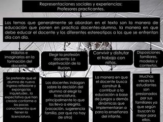 Este documento resume los temas principales tratados en un texto sobre las representaciones sociales y experiencias de los profesores practicantes. Explora las maneras en que los docentes en formación educan a los estudiantes, los estereotipos a los que se enfrentan, y los motivos para elegir la profesión docente. También analiza cómo los practicantes llevan a cabo su trabajo con los niños, las dificultades que enfrentan, y los conocimientos necesarios para tener éxito como maestros.
