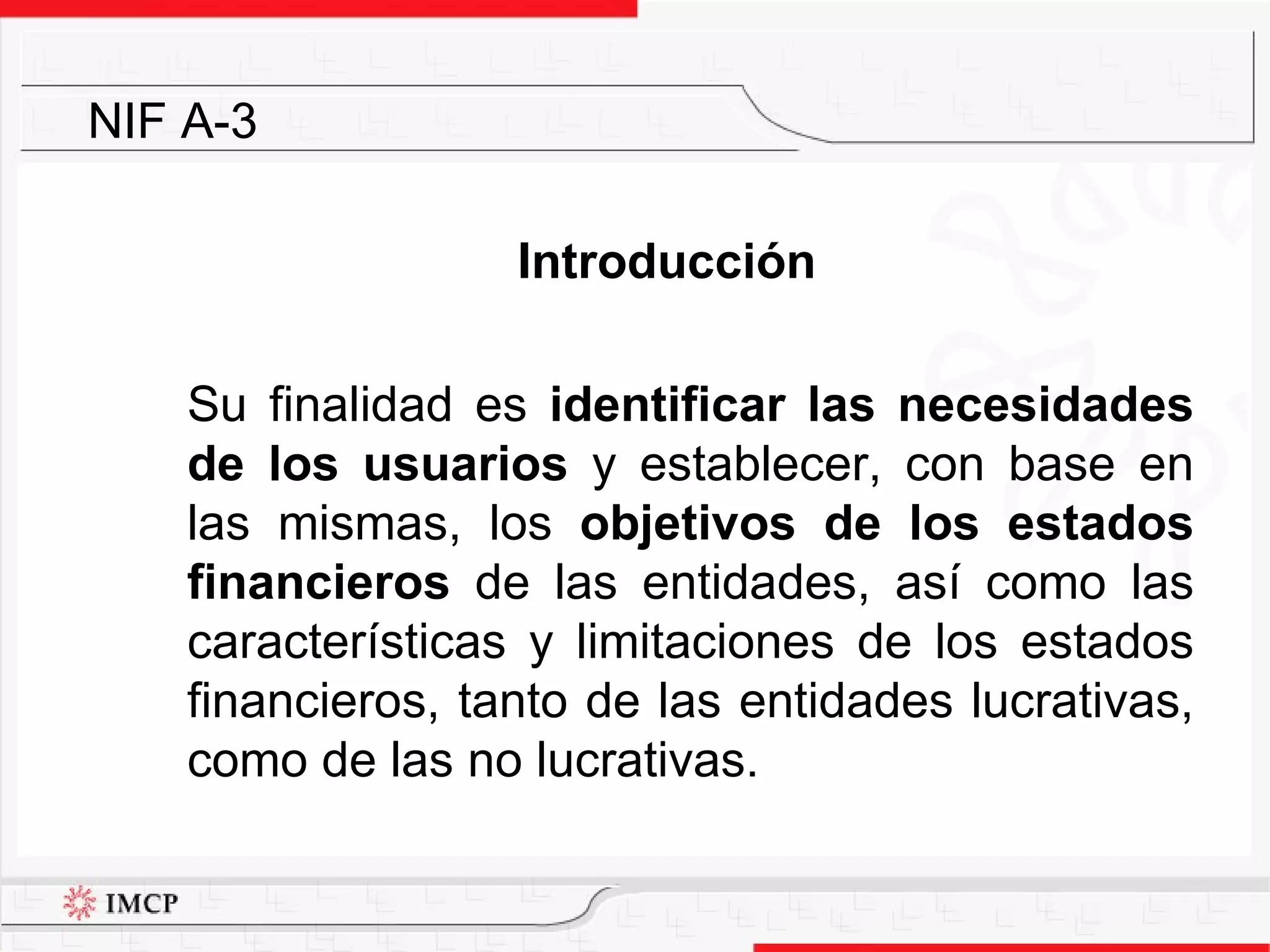 La NIF A-3 establece las necesidades de información de los usuarios de los estados financieros y los objetivos de dichos estados para entidades lucrativas y no lucrativas. Identifica a los usuarios y cómo la información financiera les permite tomar decisiones. Los estados financieros básicos son el balance general, estado de resultados, estado de variaciones en el capital contable y estado de flujos de efectivo. La NIF también describe las limitaciones de la información en los estados financieros.