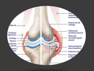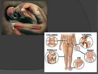 El documento proporciona información sobre cinco enfermedades degenerativas comunes: cáncer, artrosis, Alzheimer, Parkinson y diabetes. Describe los síntomas, causas, diagnóstico y tratamiento de cada una, señalando que el cáncer es el crecimiento y diseminación incontrolados de células, la artrosis es el desgaste del cartílago en las articulaciones, el Alzheimer involucra la pérdida de memoria y otras funciones cognitivas, el Parkinson afecta las células del cerebro que controlan los movimientos y la