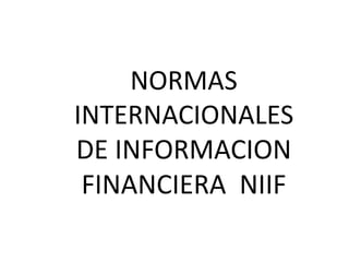 Este documento trata sobre las Normas Internacionales de Información Financiera (NIIF). Explica que las NIIF buscan mejorar la transparencia y comparabilidad de la información financiera a nivel mundial. Describe los componentes de los estados financieros, incluyendo el estado de situación financiera, estado de resultados, estado de flujos de efectivo y notas a los estados financieros. También define conceptos clave como activos, pasivos, patrimonio neto, ingresos y gastos.