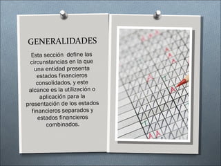 La Sección 9 establece que una entidad controladora debe presentar estados financieros consolidados que incluyan a todas sus subsidiarias controladas, a menos que la controladora sea una subsidiaria y sus estados se consoliden en otro grupo, o si la inversión se adquirió para su venta en el plazo de un año. Los estados financieros consolidados combinan los estados de la controladora y subsidiarias y eliminan saldos y transacciones intragrupo para presentar la información financiera del grupo como una sola entidad económica.