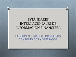 La Sección 9 establece que una entidad controladora debe presentar estados financieros consolidados que incluyan a todas sus subsidiarias controladas, a menos que la controladora sea una subsidiaria y sus estados se consoliden en otro grupo. Los estados financieros consolidados combinan los estados de la controladora y subsidiarias para presentar la información como si fuera una sola entidad económica, eliminando saldos y transacciones intragrupo. Las participaciones no controladoras deben presentarse de forma separada dentro del patrimonio consolidado.