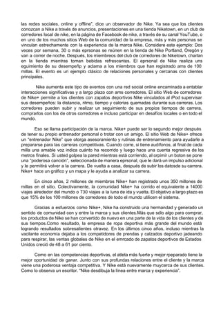 Nike revolucionó el marketing deportivo en la década de 1980 gastando generosamente en patrocinios y anuncios para construir una relación entre la marca y sus clientes. A finales de la década de 1990, las ventas de Nike cayeron, por lo que la compañía volvió a centrarse en la innovación de productos y las relaciones con los clientes mediante herramientas de marketing digital y redes sociales para crear experiencias de marca y comunidad. A través de su sitio Nike+, la compañía ha generado una comunidad de más de
