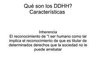 Los derechos humanos (DDHH) son inherentes a todo ser humano, son universales y progresivos. Reconocen al ser humano como titular de ciertos derechos fundamentales que no pueden ser arrebatados y que deben respetarse en un estado de derecho.