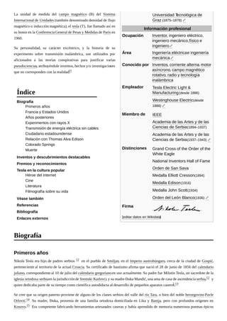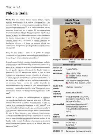 Nikola Tesla nació en 1856 en el Imperio austrohúngaro y se convirtió en un inventor e ingeniero eléctrico estadounidense muy influyente. Estudió ingeniería eléctrica en la Universidad de Graz y trabajó para varias compañías eléctricas en Budapest, París y Nueva York. Sus numerosas invenciones en el campo del electromagnetismo incluyeron el motor de corriente alterna y contribuyeron al desarrollo de la electricidad moderna. Murió en 1943 en Nueva
