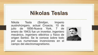 Nikola Tesla (1856-1943) fue un inventor e ingeniero serbio-estadounidense conocido por sus numerosas invenciones en el campo del electromagnetismo, incluyendo la corriente alterna y la radio. Trabajó para Edison perfeccionando el equipo eléctrico, luego fundó su propia compañía para desarrollar motores de corriente alterna. Realizó experimentos pioneros con alta tensión en Colorado y propuso un sistema mundial de transmisión de energía sin cables, aunque muchos de sus inventos y teor