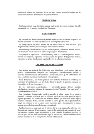 Las ninfas o carolinas son psitácidos originarios de Australia. Se caracterizan por su plumaje principalmente gris con amarillo en la cabeza y garganta. Habitan en sabanas y campos de cultivo australianos donde se alimentan de semillas. Se reproducen colonialmente en huecos de árboles, poniendo entre 5-8 huevos. En cautiverio son fáciles de criar y se han convertido en mascotas populares, aunque requieren espacio para volar y una dieta variada de semillas, frutas y verduras.