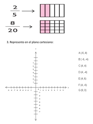 Este documento es una guía de refuerzo de matemáticas para estudiantes del Colegio cabecera del llano Sede b "meseta grande". La guía incluye instrucciones para escribir fraccionarios según imágenes, hacer operaciones con fraccionarios, representar fraccionarios en un plano cartesiano y unir puntos en el plano.