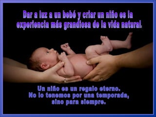 Este documento habla sobre la importancia de criar y educar a los hijos desde una perspectiva cristiana. Señala que los niños son un regalo de Dios y que los padres tienen la responsabilidad de guiarlos y enseñarles, especialmente durante los primeros cinco años cuando son más receptivos. Recomienda enseñarles sobre Jesús a través del ejemplo, el amor y las historias bíblicas para que puedan establecer una relación con Él.