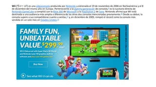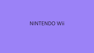 La consola Wii de Nintendo, lanzada en 2006, fue la sucesora de la GameCube y compitió con la Xbox 360 y PlayStation 3. Se destacó por su mando inalámbrico Wii Remote que detecta movimientos en 3D y permite apuntar. Desde su lanzamiento, la Wii superó en ventas a sus competidoras y rompió récords de ventas en Estados Unidos.