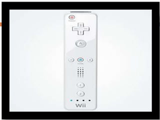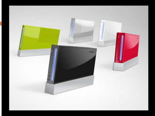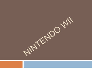 El Nintendo Wii es una consola de videojuegos lanzada en 2006 para competir con PlayStation 3 y Xbox 360. Usa controladores inalámbricos que detectan movimiento a través de sensores. Fue desarrollada originalmente bajo el nombre "Revolution" y luego lanzada como "Wii" para enfatizar la experiencia de juego compartida. Incluye accesorios como Wii Balance Board y Wii Zapper que expanden sus capacidades.