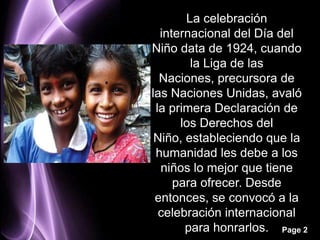 Este documento habla sobre el apoyo empresarial a la infancia y los derechos de los niños. Describe cómo las Naciones Unidas establecieron la primera Declaración de los Derechos del Niño en 1924 y cómo en 1989 aprobaron la Convención sobre los Derechos del Niño. También explica cómo alrededor de 40 empresas apoyan a la Corporación Día del Niño en Colombia y cómo parte de los recursos de las empresas han permitido investigaciones sobre el juego y el desarrollo infantil. Finalmente, presenta 10 principios para que las empresas respeten y