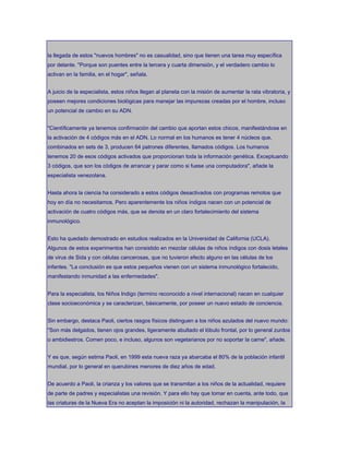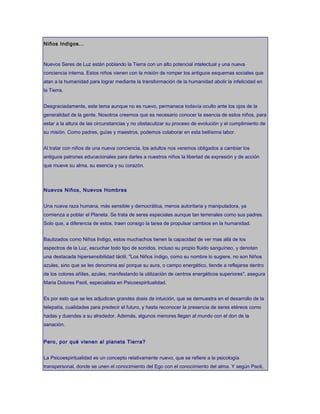 El documento habla sobre los llamados "Niños Indigos", seres con una nueva conciencia que vienen a elevar la frecuencia vibratoria de la Tierra y lograr cambios evolutivos en la humanidad. Estos niños tienen habilidades intuitivas y una misión de sanación. Se describen sus características físicas y de comportamiento, y se argumenta que requieren nuevos enfoques educativos y de crianza que respeten su individualidad y creatividad.
