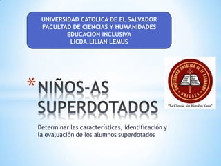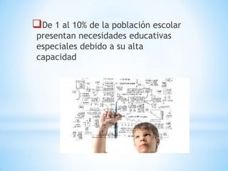 Este documento describe las características de los estudiantes superdotados y sus necesidades educativas especiales. Entre el 1-10% de la población escolar son superdotados. Se han utilizado varios términos para describirlos, como niños excepcionales o altamente capacitados. Los estudiantes superdotados requieren estrategias educativas diferenciadas como aceleración del currículo, enriquecimiento y agrupamiento por habilidad para satisfacer sus necesidades de aprendizaje.