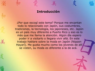 Este documento describe varios estilos de moda populares entre los jóvenes en Japón, incluyendo Gothic Lolita, Visual Kei, Ganguro y Kogal, Decora y Kawaii, y Cosplay. Explica las características distintivas de cada estilo, como la ropa, maquillaje, accesorios y subculturas asociadas. El objetivo es informar a los lectores sobre la moda japonesa.