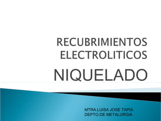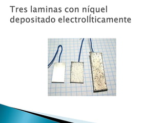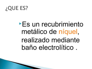 Este documento describe el proceso de niquelado, que es un recubrimiento metálico de níquel aplicado mediante baño electrolítico. El niquelado se usa para aumentar la resistencia a la oxidación y corrosión de elementos metálicos y mejorar su apariencia. El proceso puede producir acabados mate o brillante dependiendo de las condiciones del baño electrolítico.
