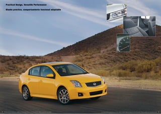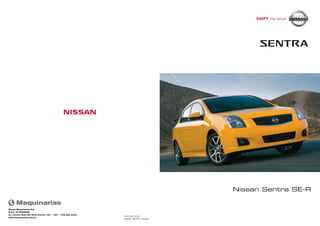 Este documento presenta el Nissan Sentra SE-R, describiendo sus características principales como un motor de 1.6 litros con 105 caballos de fuerza, frenos de disco delanteros, transmisión manual de 5 velocidades o automática de 4 velocidades, y características de seguridad como cinturones de seguridad de 3 puntos y alarma antirrobo. El documento también destaca las comodidades como aire acondicionado, asientos delanteros reclinables y un sistema de audio con 4 bocinas.
