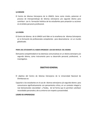 Este documento presenta el silabo del curso de inglés niveles 1 y 2 del Centro de Idiomas de la Universidad Nacional de Chimborazo. El silabo describe la misión, visión y objetivos del curso, así como los contenidos, resultados de aprendizaje y metodología para cada una de las 5 unidades del nivel 1 e incluye información sobre los créditos, requisitos previos, bibliografía y responsables.
