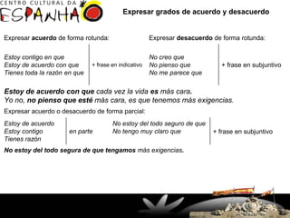 El documento describe diferentes formas de expresar acuerdo, desacuerdo y grados intermedios de acuerdo/desacuerdo. También explica cómo suavizar críticas negativas y cómo referirse a hechos conocidos sin nombrarlos directamente usando expresiones como "lo de" + sustantivo o infinitivo.