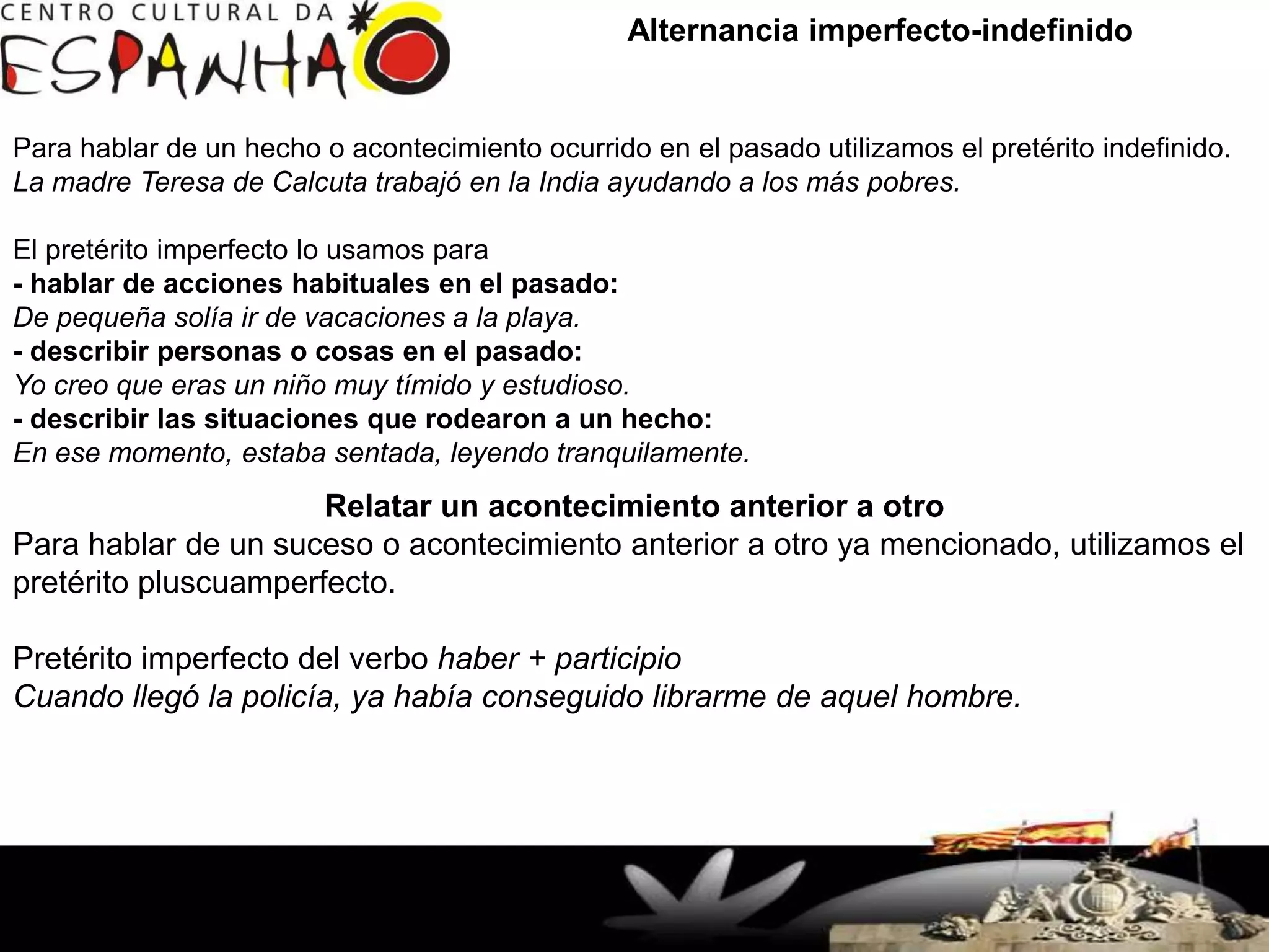 El documento explica la diferencia entre el pretérito imperfecto y el pretérito indefinido. El pretérito indefinido se usa para hablar de hechos o acontecimientos pasados, mientras que el pretérito imperfecto se usa para describir acciones habituales pasadas, describir personas o cosas en el pasado, o describir las circunstancias alrededor de un hecho pasado. También explica el uso del pretérito pluscuamperfecto para hablar de un suceso anterior a otro ya mencionado.