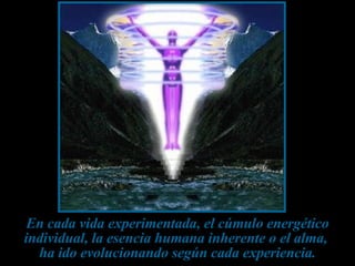 El documento describe cómo el alma humana evoluciona a través de las experiencias de vida, lo que determina el nivel de conciencia individual. Explica que cada persona desarrolla sus energías inherentes como la bondad, la verdad y el amor de manera diferente, lo que afecta su personalidad y carácter. Además, el documento señala que cuando una persona muere, su energía y patrón kármico continúan evolucionando y afectando las condiciones de su próxima vida.