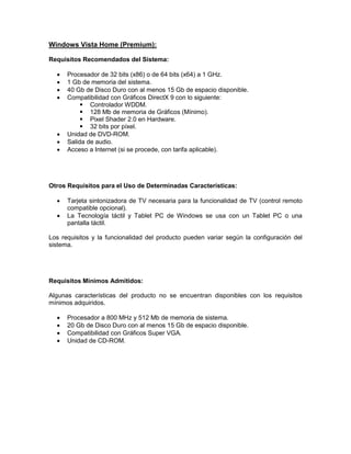 El documento describe los requisitos de hardware y software recomendados y mínimos para diferentes versiones de Windows, incluyendo Windows XP, Vista y 7. Se especifican los requisitos de procesador, memoria RAM, almacenamiento, tarjeta gráfica y otros periféricos. También se incluyen detalles sobre las unidades de medida utilizadas para describir el almacenamiento y la velocidad de procesamiento en computadoras.
