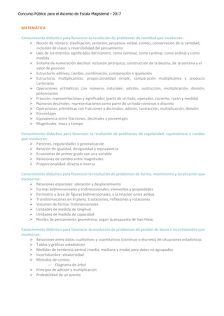 Este documento presenta el temario de la prueba única nacional del concurso para el ascenso de escala magisterial en Perú. El temario cubre diversos temas relacionados a la práctica pedagógica como teorías de aprendizaje, desarrollo del estudiante, áreas curriculares como matemáticas, comunicación, ciencia, y temas transversales como personal social y ciudadanía. El objetivo es evaluar el conocimiento didáctico de los participantes para favorecer el desarrollo de competencias en los estudiantes