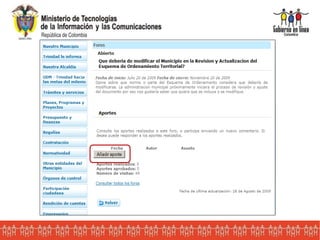 Este documento describe los tipos de plantillas, campos y canales disponibles en el sistema Gobierno en Línea Territorial para personalizar los sitios web de las entidades. Incluye 10 plantillas iniciales y explica campos como menús desplegables, fechas y archivos adjuntos. También cubre cómo editar ítems, configurar el canal principal y canales de participación como foros y chat para interactuar con los ciudadanos.