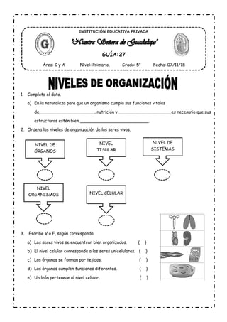 El documento describe los diferentes niveles de organización biológica en los seres vivos, incluyendo el nivel celular, nivel de tejidos, nivel de órganos, y nivel de sistemas. Explica que las células se agrupan para formar tejidos, los tejidos se organizan en órganos para cumplir funciones específicas, y varios sistemas forman un organismo completo.