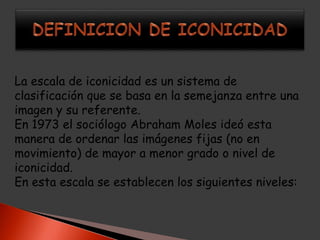 La escala de iconicidad clasifica las imágenes según su semejanza con el referente, desde representaciones no figurativas hasta imágenes naturales idénticas. Abraham Moles ideó esta escala en 1973 para ordenar imágenes fijas de mayor a menor iconicidad, estableciendo nueve niveles como representaciones no figurativas, esquemas, pictogramas, representaciones figurativas, fotografías y modelos tridimensionales.