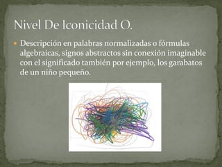 El documento describe diferentes tipos de representación visual, desde lo más abstracto como descripciones en palabras o fórmulas algebraicas, hasta lo más realista como una imagen en color o la propia imagen real del objeto, pasando por representaciones no figurativas, esquemas arbitrarios y motivados, pictogramas, pintura no realista y realista, fotografía en blanco y negro e hologramas.