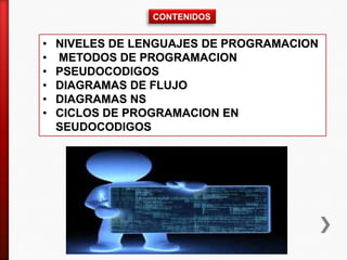 El documento describe diferentes conceptos relacionados con los lenguajes de programación, incluyendo los diferentes niveles de lenguajes (bajo nivel, ensamblador y alto nivel), pseudocódigos, diagramas de flujo y diagramas Nassi-Shneiderman. También explica los ciclos de programación comunes como "mientras...entonces", "si...entonces" y "desde...hasta" y en qué casos se usan.