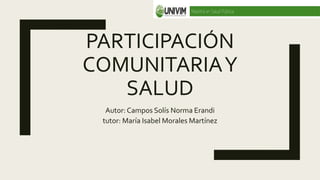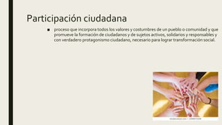 Este documento discute la importancia de la participación comunitaria para la salud. Explica que la participación ciudadana involucra valores y costumbres de una comunidad para promover ciudadanos activos y responsables. También destaca que la salud y la educación son servicios que una comunidad debe brindar para satisfacer el desarrollo social. La comunidad debe jugar un papel activo en la autogestión y solución de problemas de salud para alcanzar objetivos de desarrollo comunitario.