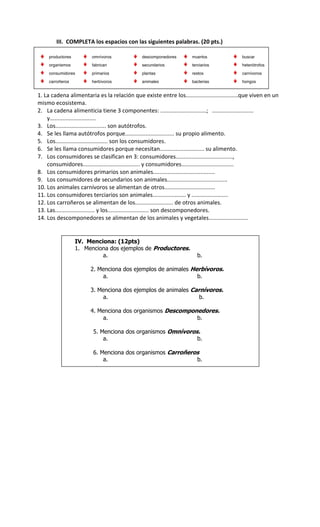 Este documento presenta una tarea sobre cadenas alimentarias y niveles tróficos. La tarea incluye emparejar términos con sus definiciones, construir una red alimentaria con diferentes organismos y flechas, completar oraciones con palabras clave, y mencionar ejemplos de productores, herbívoros, carnívoros, descomponedores, omnívoros y carroñeros. La tarea debe enviarse antes del viernes 20 de marzo de 2020.
