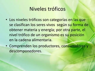 El documento describe los diferentes niveles tróficos en una cadena alimentaria, incluyendo productores, consumidores primarios, secundarios, terciarios y descomponedores. Explica que los niveles tróficos clasifican a los seres vivos de acuerdo a cómo obtienen materia y energía. También menciona que el tema de los niveles tróficos se enseña en 4to grado como parte del bloque sobre ecosistemas y cadenas alimentarias.