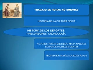 Este documento trata sobre la historia de varios deportes y actividades físicas como el ajedrez, la gimnasia, el patinaje artístico y más. Explica los orígenes y precursores de estos deportes en la antigüedad, su desarrollo a través de los años y figuras importantes. También menciona escuelas de pensamiento en el ajedrez y hitos en la historia de estos deportes como la creación de federaciones y su inclusión en los Juegos Olímpicos.