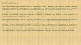 El documento define la auditoría y sus diferentes tipos. Define la auditoría como el examen sistemático de las operaciones y actividades de una entidad para determinar su grado de cumplimiento con los criterios establecidos. Describe las diferencias entre una auditoría externa e interna y las clases de auditorías, incluyendo la auditoría operativa, externa, interna y de sistemas. También cubre la importancia de la auditoría informática y el perfil y objetivos del auditor informático.