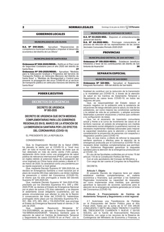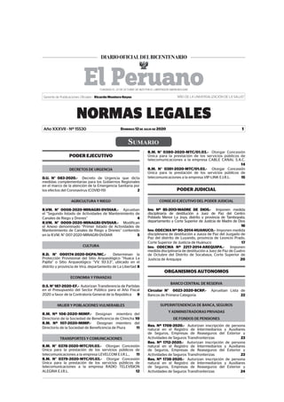 El documento presenta una serie de decretos de urgencia y resoluciones ministeriales de diferentes ministerios del gobierno peruano. Entre ellos se incluye un decreto de urgencia que otorga fondos a los gobiernos regionales para implementar centros de aislamiento temporal y seguimiento para atender la emergencia sanitaria causada por el COVID-19. También presenta resoluciones sobre designaciones en directorios, concesiones para servicios de telecomunicaciones y otras medidas legales de distintos sectores del gobierno.