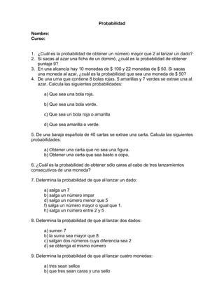 El documento presenta 9 preguntas sobre probabilidad que involucran el lanzamiento de dados, sacar fichas de dominó o cartas de una baraja, y sacar monedas de una alcancía. Las preguntas calculan la probabilidad de eventos como obtener números mayores que cierto valor, puntajes específicos, ciertas combinaciones de resultados, y el tipo de moneda o carta extraída al azar de entre opciones dadas.