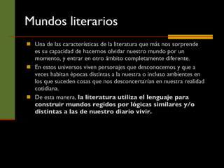 El documento describe diferentes tipos de mundos ficticios creados por la literatura, incluyendo mundos cotidianos, oníricos y míticos. Explica que los mundos cotidianos representan realidades similares a la vida diaria, los mundos oníricos rompen las expectativas lógicas y los mundos míticos presentan explicaciones sobrenaturales para fenómenos naturales. También describe mundos realistas, fantásticos, maravillosos y legendarios según el efecto que buscan lograr en el lector.