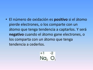 El número de oxidación representa el número de electrones que un átomo pone en juego al formar un compuesto, es positivo si el átomo pierde electrones y negativo si los gana. La carga eléctrica de los iones monoatómicos coincide con su número de oxidación, el cual se escribe con signo a la izquierda como en los números enteros.