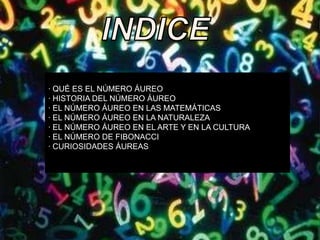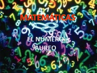 El documento describe el número áureo, también conocido como número de oro o sección áurea. Explica que se trata de un número irracional infinito y no periódico que se encuentra en la naturaleza y el arte desde la antigüedad. También se relaciona con la sucesión de Fibonacci y ha sido estudiado por matemáticos como Euclides y Kepler. Se usa para representar proporciones en diversos campos como la arquitectura, la música y las obras de artistas renacentistas como Leonardo da Vinci y Miguel Áng