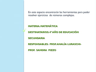 Este documento presenta una propuesta para enseñar números complejos a estudiantes de 4to año de secundaria utilizando redes sociales y herramientas digitales. El objetivo es que los estudiantes aprendan conceptos y operaciones básicas de números complejos mientras desarrollan habilidades para buscar y analizar información en línea. La propuesta incluye actividades, recursos y una evaluación para medir el aprendizaje de los estudiantes.