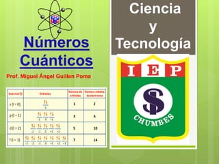 Los números cuánticos determinan la región del espacio-energía donde es más probable encontrar un electrón y consisten en cuatro números: 1) El número cuántico principal (n) define el nivel de energía; 2) El número cuántico azimutal (l) indica la forma del orbital; 3) El número cuántico magnético (m) describe la orientación del orbital en el espacio; 4) El número cuántico de spin (s) indica el sentido de giro del electrón. La teoría cuántica fue desarrollada por físicos como Plan