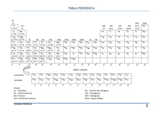 El documento presenta una extensa tabla de números de oxidación de iones monoatómicos y poliatómicos, junto con sus respectivos nombres y símbolos. También incluye detalles sobre la configuración electrónica de elementos y conversión de temperaturas. Se organizan los elementos según sus grupos en la tabla periódica y se ofrecen equivalencias para conversiones relacionadas con los moles.