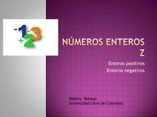 El documento describe los números enteros, incluyendo los enteros positivos y negativos. Explica que los enteros positivos se obtienen colocando el signo + delante de los números naturales, mientras que los enteros negativos se obtienen colocando el signo - delante de los números naturales. También cubre la suma y resta de números enteros.