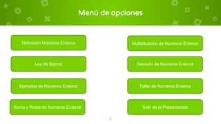 Este documento presenta una introducción a los números enteros para estudiantes de octavo grado. Explica que los números enteros incluyen los números naturales, sus opuestos negativos y cero. También describe la ley de signos para sumar y restar números enteros y proporciona ejemplos de números enteros como 430, 12, 2.711, etc. El documento contiene secciones sobre suma, resta, multiplicación y división de números enteros así como un taller práctico.