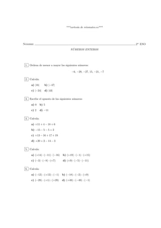 Este documento presenta un conjunto de ejercicios sobre números enteros. Incluye problemas de ordenar números, calcular valores absolutos, opuestos, sumas, restas, multiplicaciones, divisiones, múltiplos comunes, factores primos y divisores. Se pide resolver doce ejercicios que abarcan diferentes operaciones y conceptos básicos sobre números enteros.