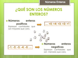 El documento habla sobre los números enteros. Explica que los números enteros incluyen los positivos, negativos y cero. Describe cómo se representan y comparan los números enteros en una recta numérica. También explica cómo realizar operaciones básicas como suma, resta, multiplicación y división con números enteros siguiendo la ley de los signos.
